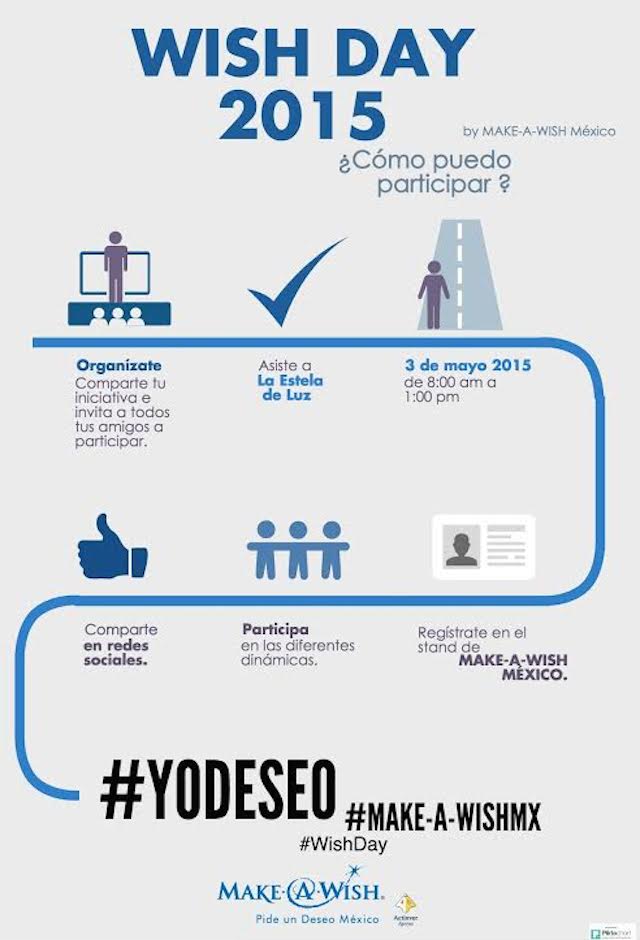 Además, el próximo domingo 3 de mayo podrás participar en el Wish Day 2015, que se llevará a cabo de 8 a 13 horas en La Estela de Luz para conmemorar los primeros 3 años de Make-A-Wish en México. Ahí encontrarás varias dinámicas y podrás registrarte a esta organización.
